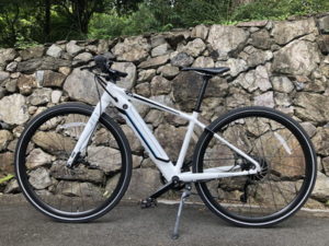 JF1は、コンベンショナルなクロスバイクスタイルで、汎用性の高い700×35Cのタイヤを履いていて、乗り味はまさにスポーティなクロスバイクそのものです。アシストモードは3種類あって、最強モードにすると急な上り坂も平地を行くのとほとんど変わらず、麓から峰山まで2kmで標高差200mのヒルクライムをいともたやすく駆け上りました。