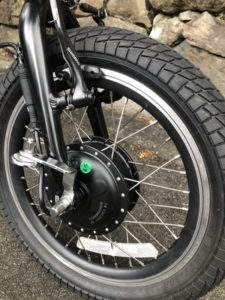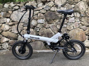 ところが、走り出してびっくりしたのは、ノンアシストのときよりもアシストを効かせたほうが車体は真っ直ぐに進んで安定するのです。それもそのはず、このベネリの”mini Fold 16″のアシスト駆動輪は、フロントなのです。前のタイヤが引っ張ってくれるので、大径車のような安定感で、段差などを乗り越えてもぜんぜん不安感がありません。