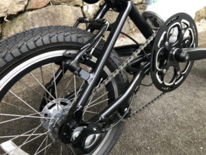 このサイズの自転車はとても小回りが効くので、街中では自由自在です。リアホイールは3速の内装ギアが装備されていますが、アシストを効かせていれば、よほどの急坂にならない限り、3速に入れたままで軽快に走ってしまいます。
