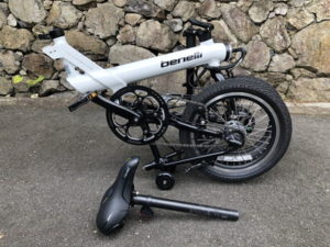 これは折りたたみ可能モデルで、さすがミニサイクルサイズなだけあって、折りたたんでしまえば、小型車のトランクに入れても、まだまだ余裕があります。フレーム内蔵バッテリーのおかげで重量バランスも良く、持ち運びにもそれほどの重さは感じません。レジャーに出かけるときにトランクに入れて行って、現地で気軽な足として使うのにも最適です。